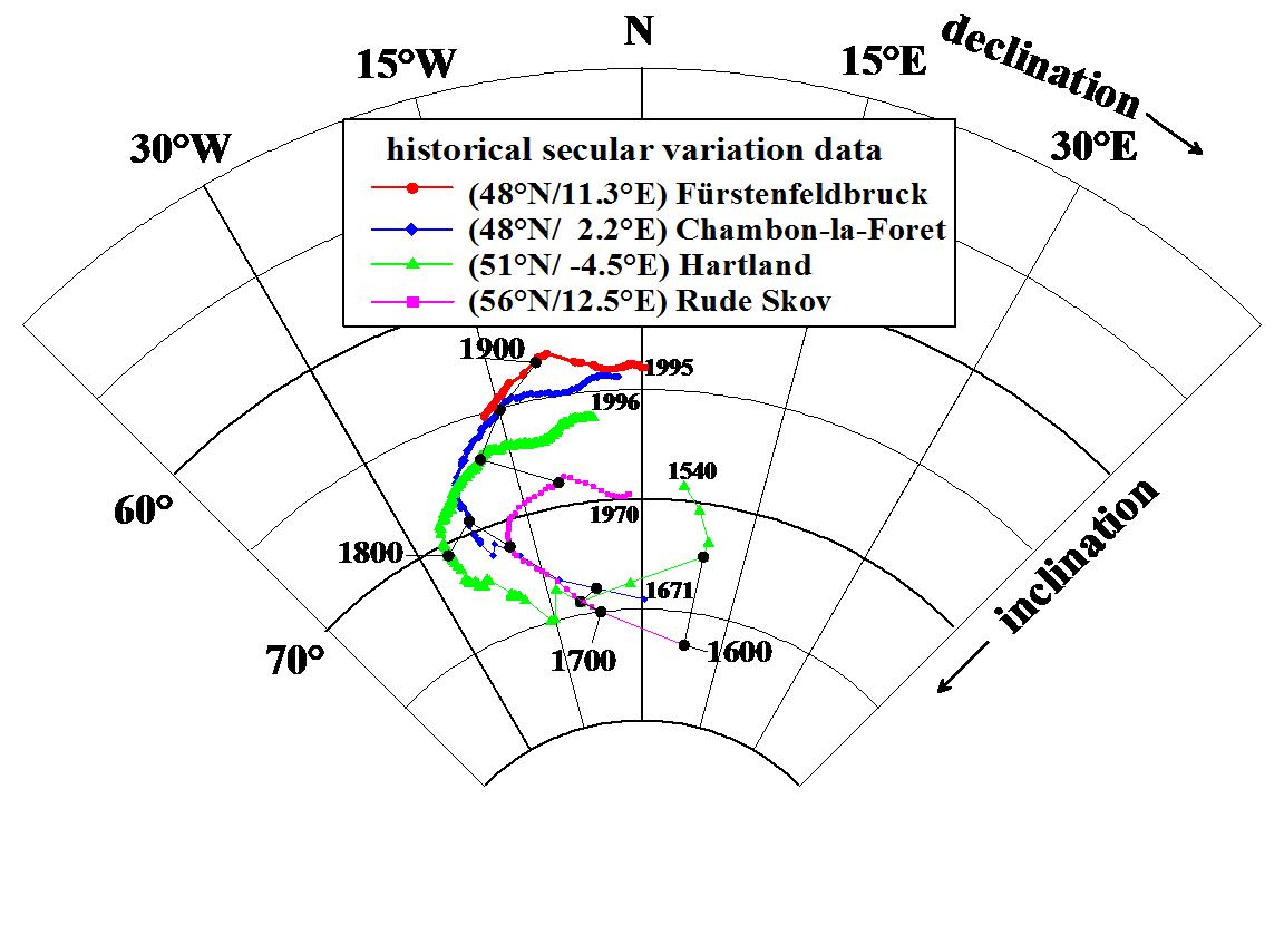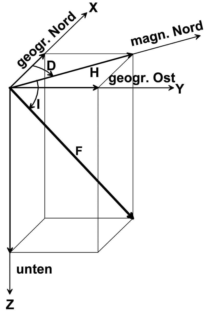 Das Erdmagnetfeld (EMF) kann in erster Näherung durch das Feld eines Dipols (Stabmagnet mit Polanstand Null) beschrieben werden, der heute um ca. 11,5° gegen die Rotationsachse geneigt ist. Ein Magnetkompass richtet seine Nadel an der Feldlinie aus und zeigt somit auf den magnetischen Pol (Durchstoßpunkt der Dipolachse). Die Feldlinien stehen am magnetischen Pol senkrecht, sind in mittleren Breiten geneigt, während sie am magnetischen Äquator horizontal gerichtet sind. Der magnetische Feldvektor wird durch die drei erdmagnetischen Elemente Deklination (D), Inklination (I, zusammen ergeben sie die Richtung des EMFs) und die Intensität (F) bestimmt. Die Deklination ist der vom Kompass angezeigte Winkel der magnetischen Nordrichtung relativ zu geographisch Nord, die Inklination ist die Neigung der Magnetfeldlinie zur Erdoberfläche, während die Intensität die Stärke des EMFs ist.